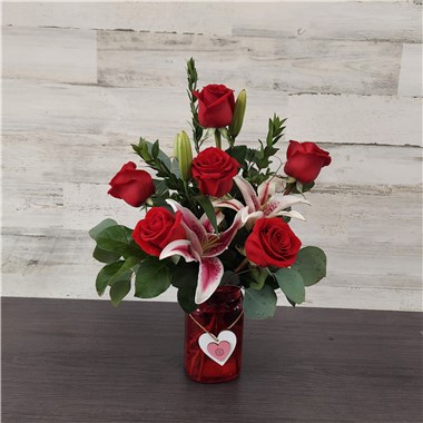 Send them your love with this an arrangement of 6 roses, a stargazer lily, and unique greenery arranged in a Valentine's Day vase.